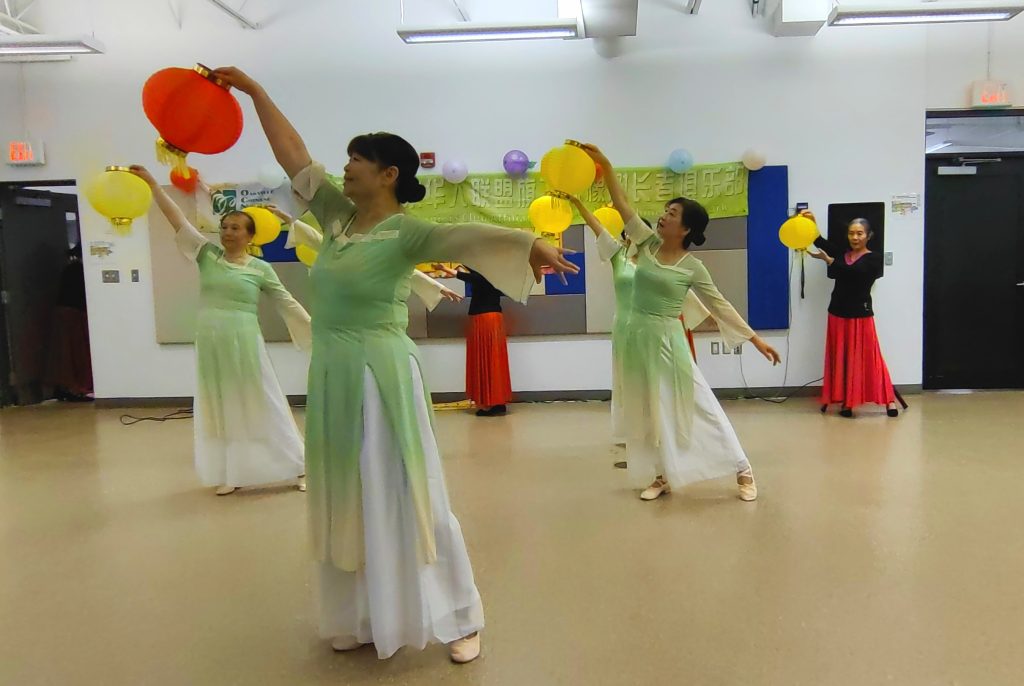 传统节目——戏剧表演《嫦娥奔月》,资深演员韩仲莲长袖起舞,虽然年事已高,但动作利落、唱舞俱佳。