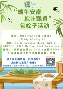 端午安康,粽叶飘香 – 包粽子活动 年年岁岁过端午,岁岁年年粽飘香”,中国传统佳节—端午节即将来临,奥克维尔华人联盟(OCN)拟于6月18日(周日)举办“端午安康,粽叶飘香”包粽子活动(详见海报),届时将有长者朋友们在现场手把手教大家包粽子,欢迎积极参加,共同欢度传统佳节!请有兴趣参加的朋友们于6月12日前点击链接、了解详情并报名参加:https://shorturl.at/syJW3 Read More » June 7, 2023 9:02 pm